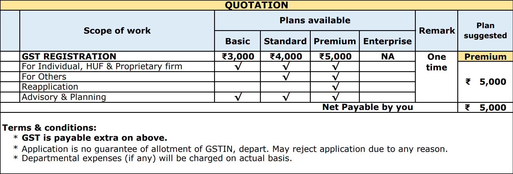 We are pleased to submit our plans available for GST Registration. You can opt for any plan, which suits to your organisation.